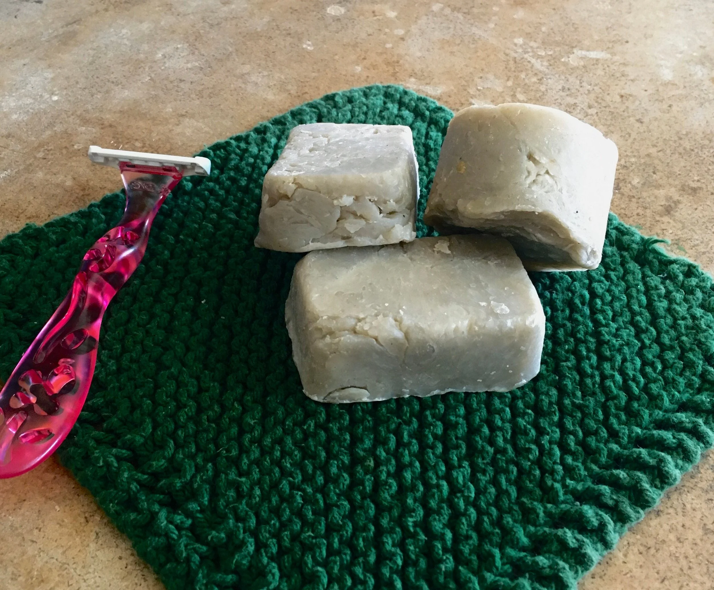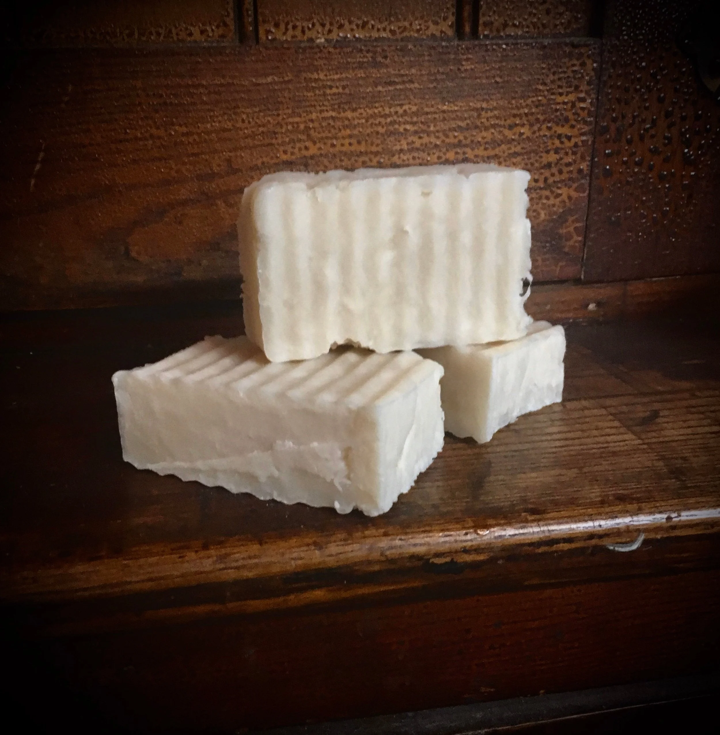 Three blocks of white soap with ridged textures on a decorative ceramic dish on a wooden table, surrounded by napkins and various items in the background.